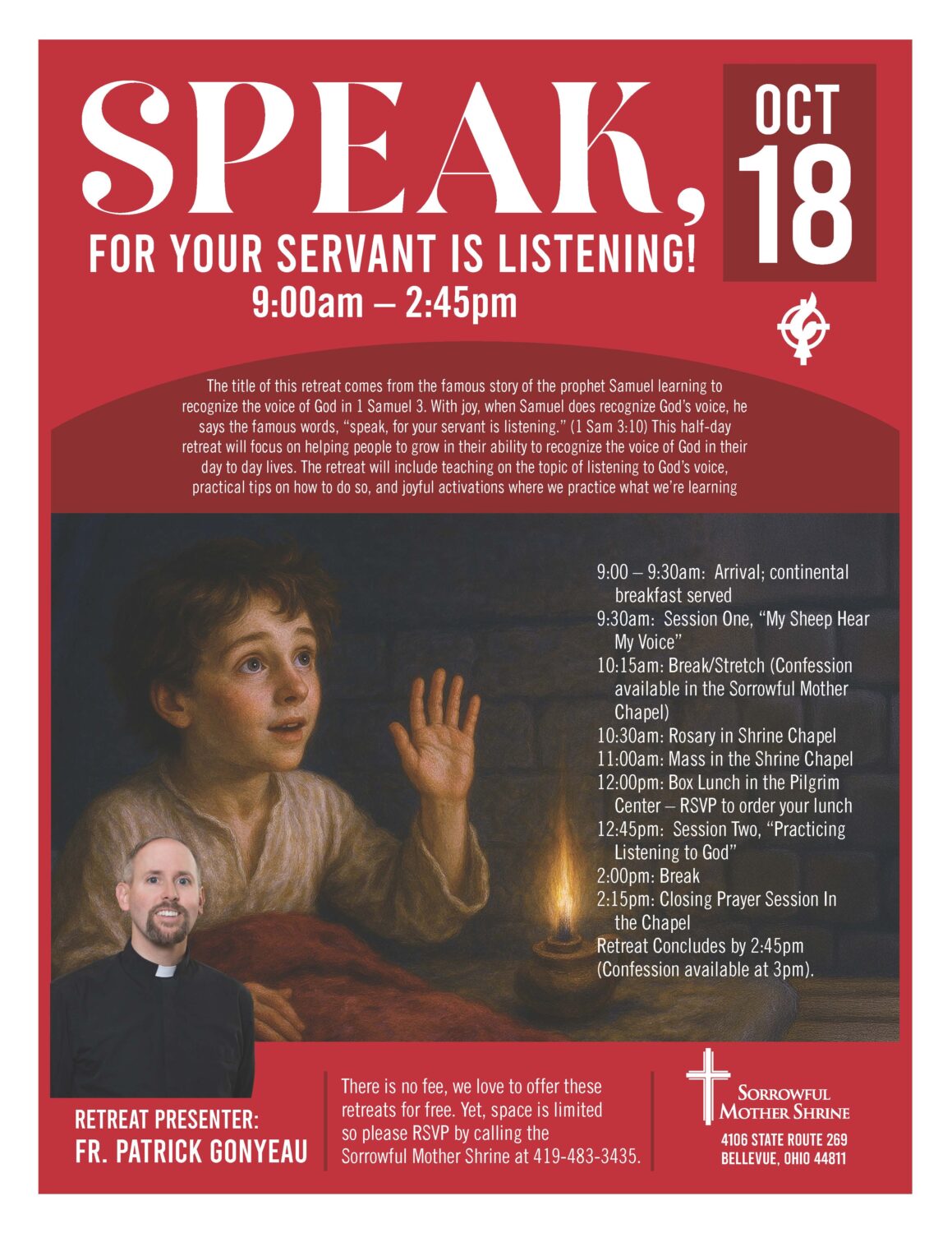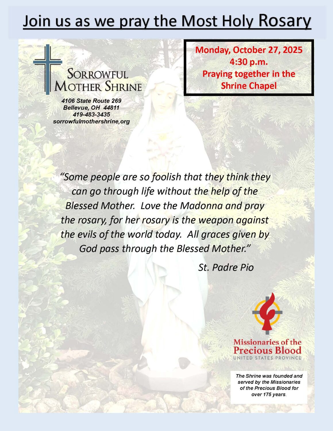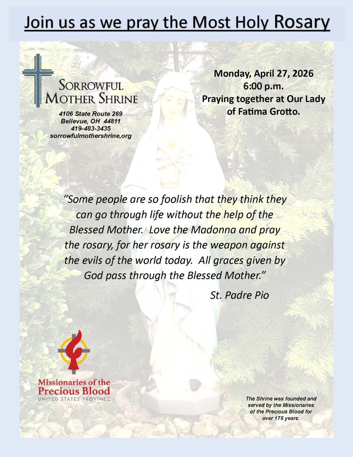 To schedule a pilgrimage, call the Shrine office – 419-483-3435 option 4 or email – shelley@sorrowfulmothershrine.org